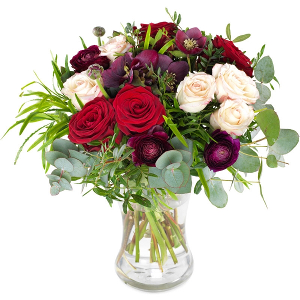 Låt våra professionella florister skapa en kärleksbukett där röda och burgundyfärgade blommor elegant kontrasteras mot krämfärgade rosor. Med sina djupa röda nyanser och säsongens gröna inslag är den det perfekta valet när du vill överraska din kärlek med blommor på Alla hjärtans dag den 14 februari. Buketten är ett exklusivt floristhantverk där varje blomma noggrant valts ut för att hålla hög kvalitet. Varje bukett är unikt designad just för dig och binds utifrån sortiment och säsong. Buketten levereras av en lokal florist. Buketten är ett exklusivt floristhantverk där varje blomma noggrant valts ut för att hålla hög kvalité. Varje bukett är unikt designad just för dig och binds utifrån sortiment och säsong. Buketten levereras personligen av din lokala florist.